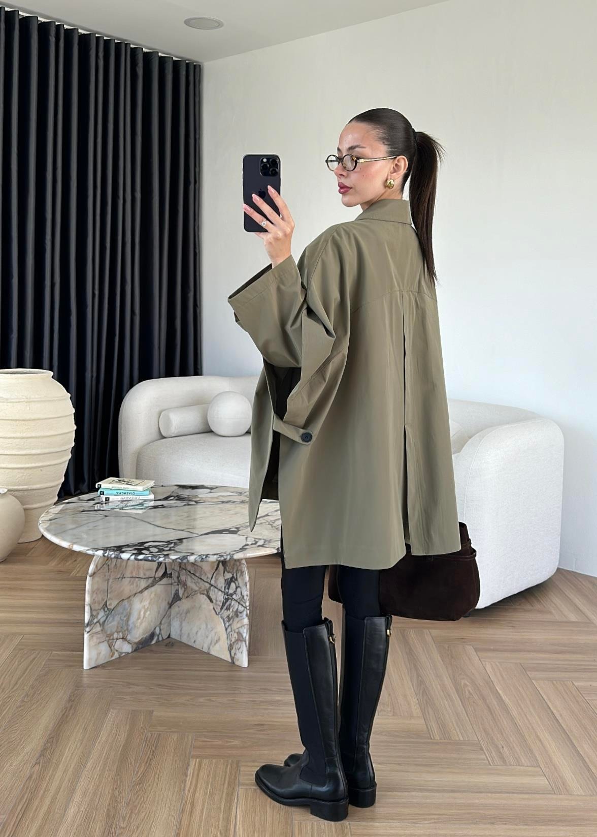 Uzun Kollu Pelerin Trençkot HAKİ