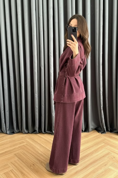 V Yakalı Denim Takım BORDO