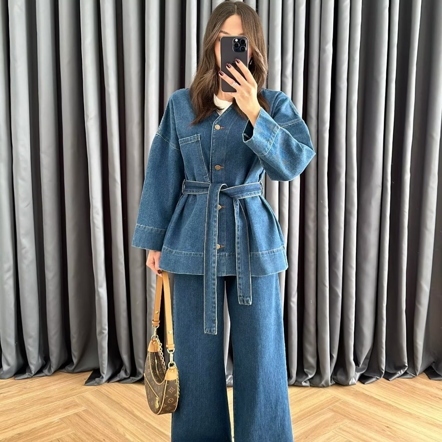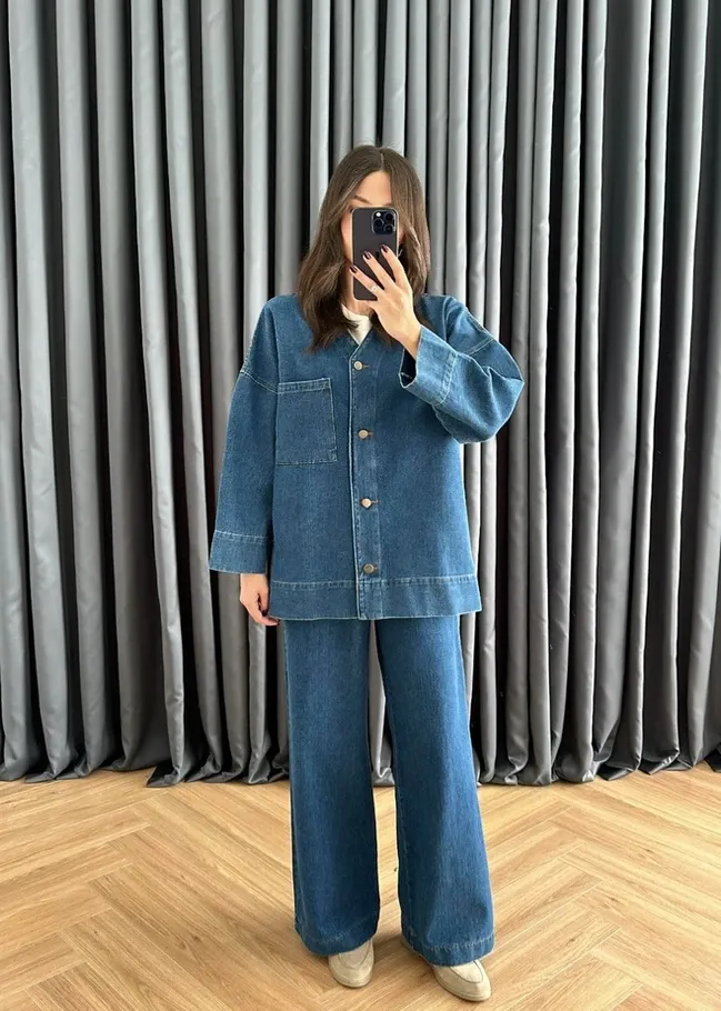 V Yakalı Denim Takım KOYU MAVİ