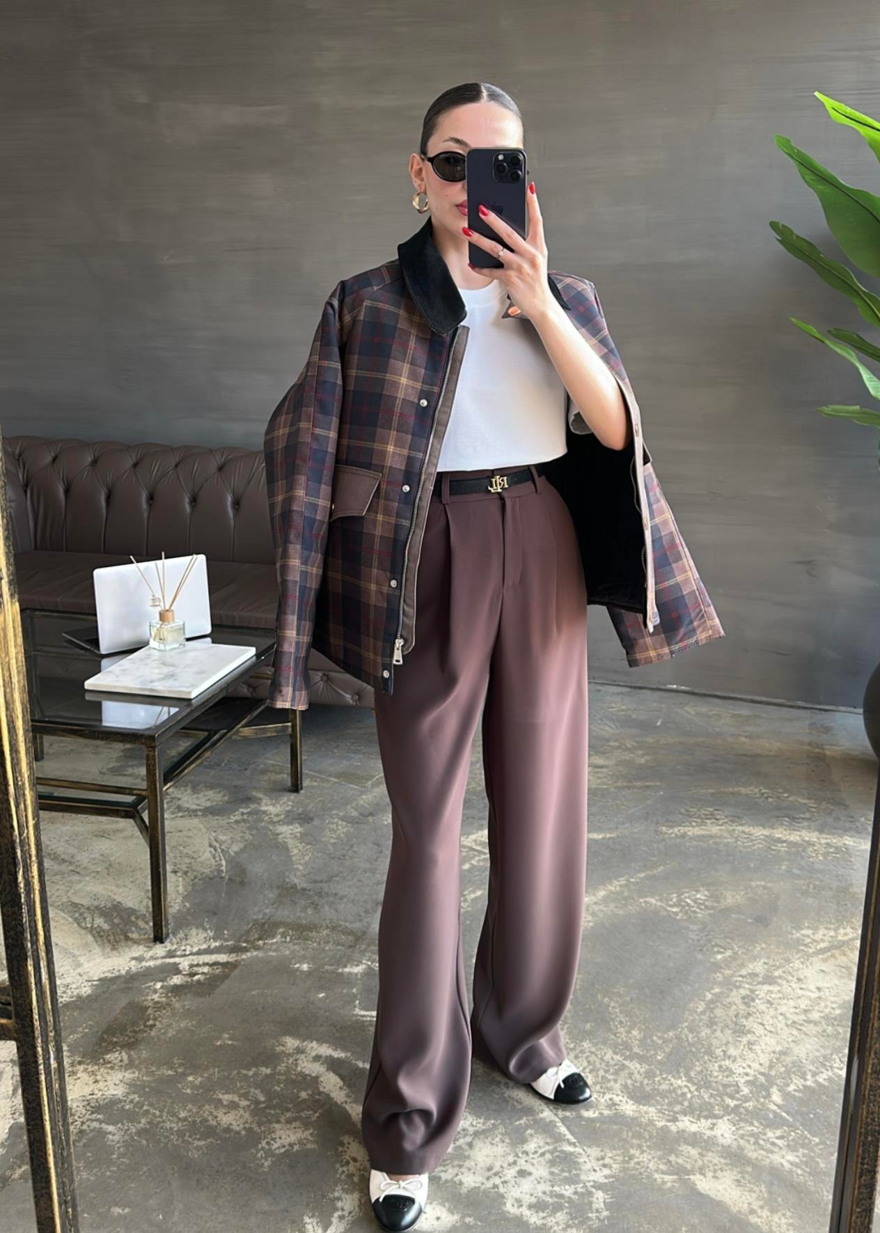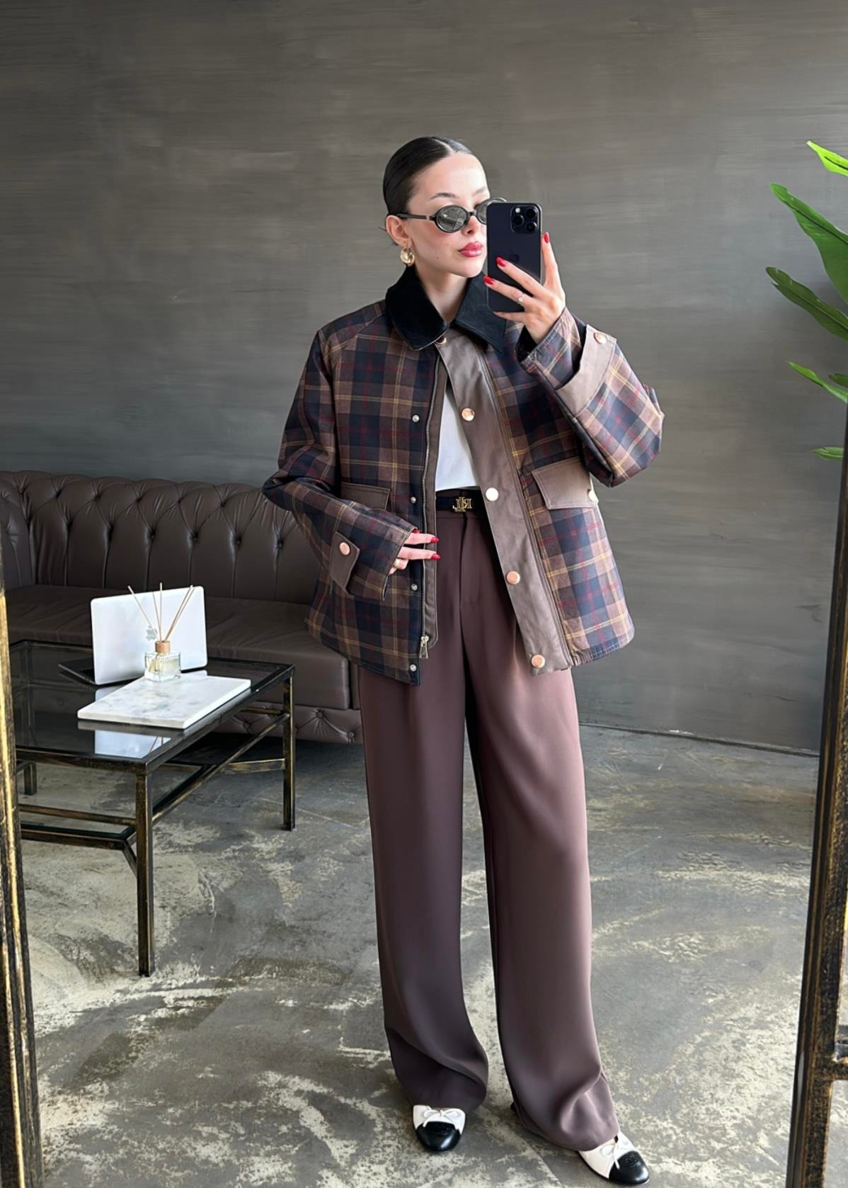 Çekimde S Beden kullanılmıştır. Tam kalıptır, kendi bedeninizi alabilirsiniz. Fermuarlıdır, içi ekose astarlıdır.