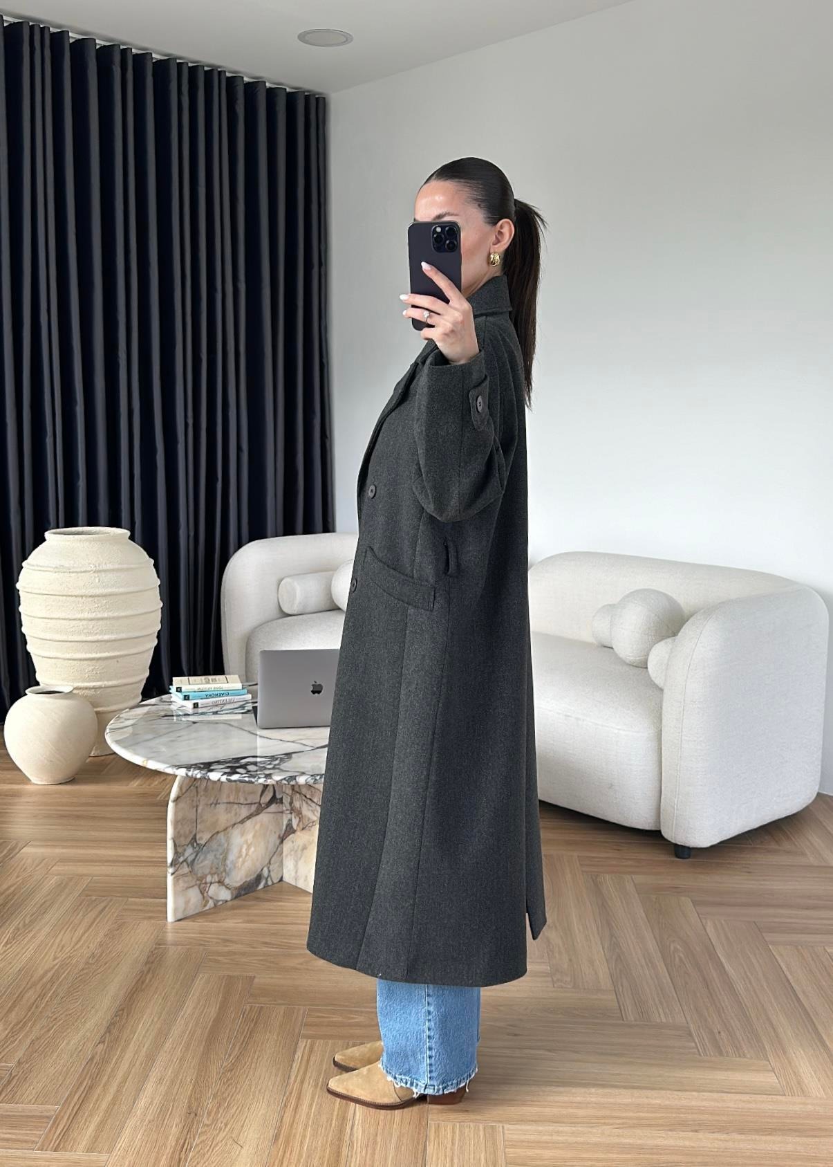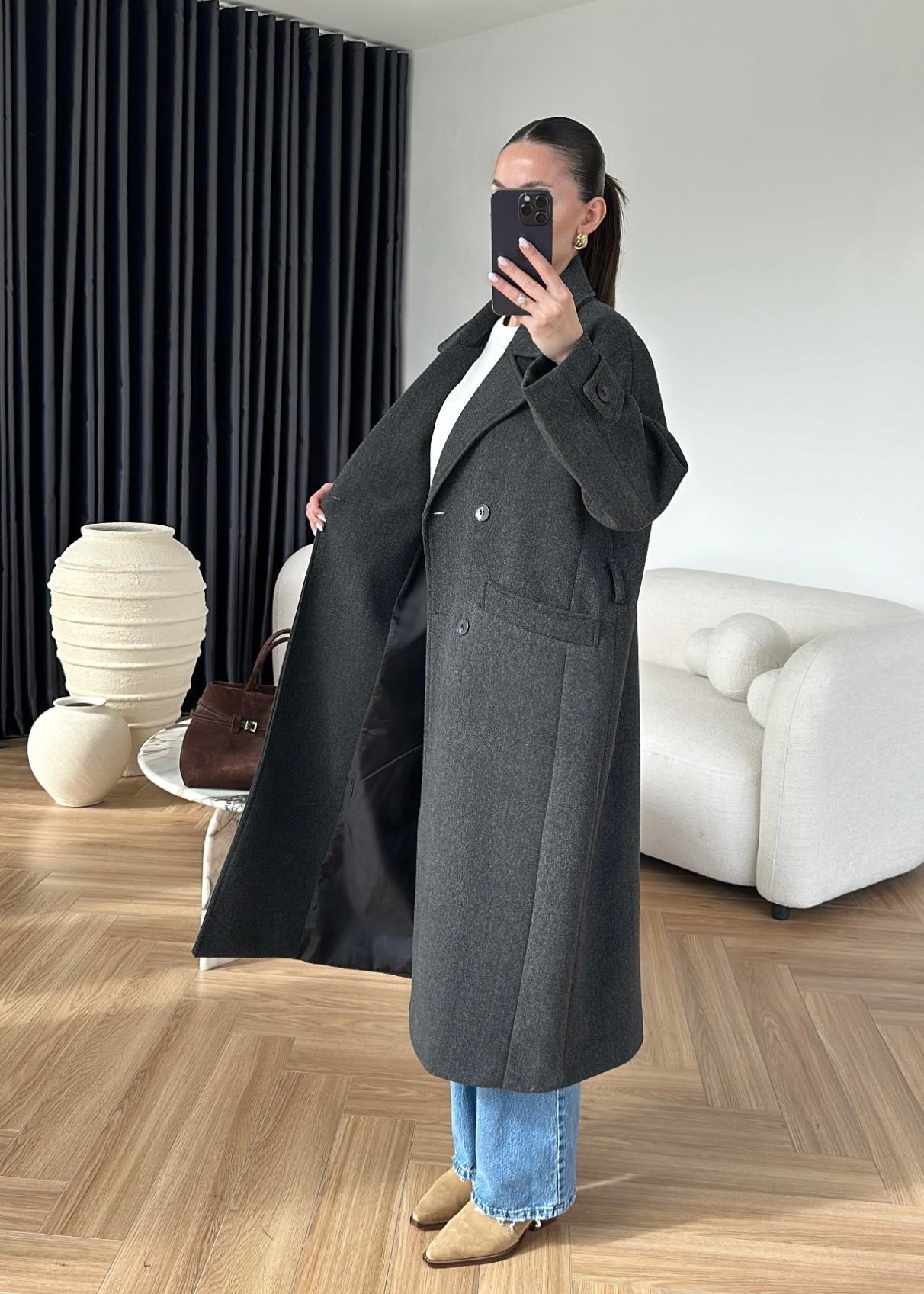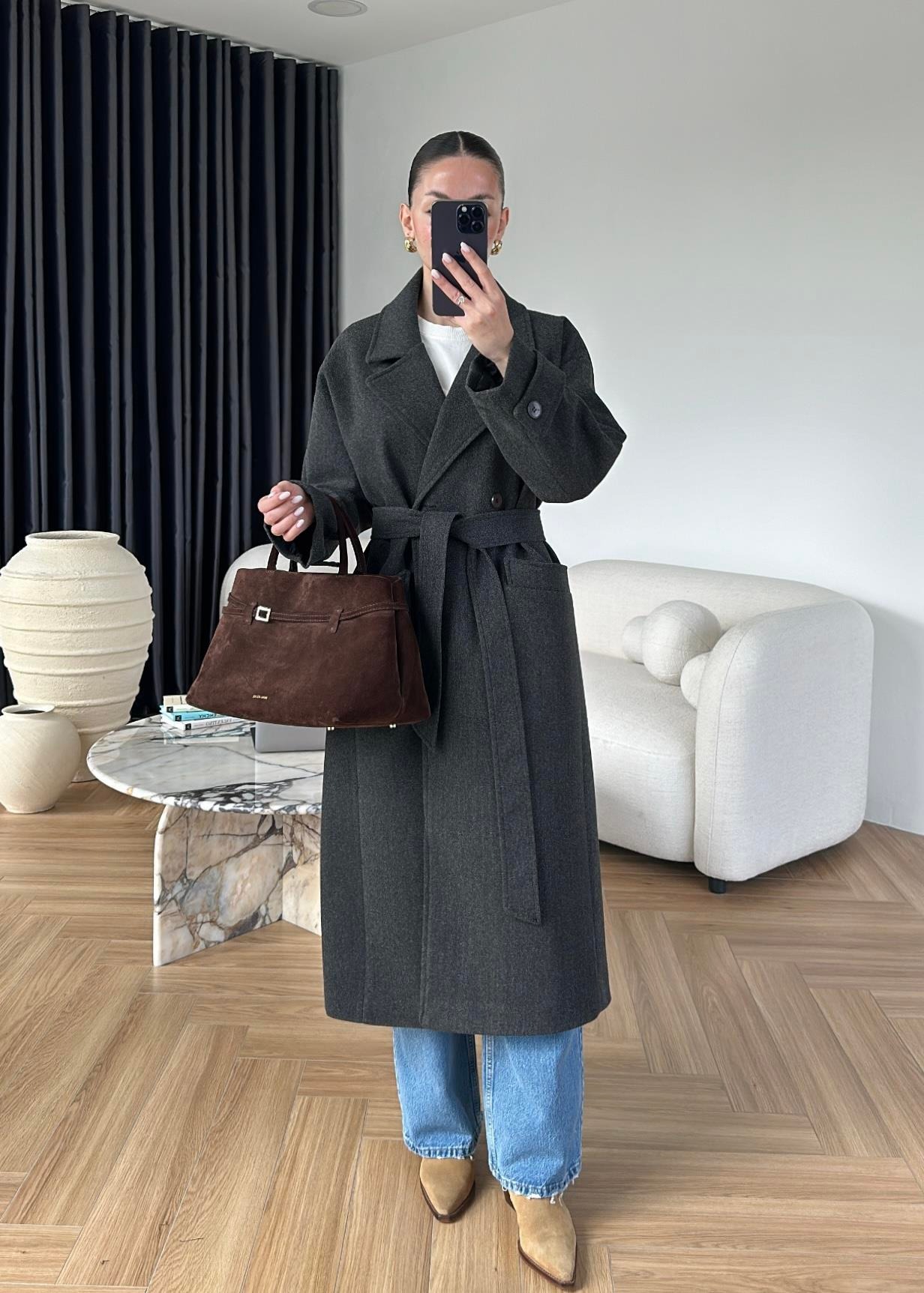 İki Düğmeli Kuşaklı Kaban KOYU ANTRASİT