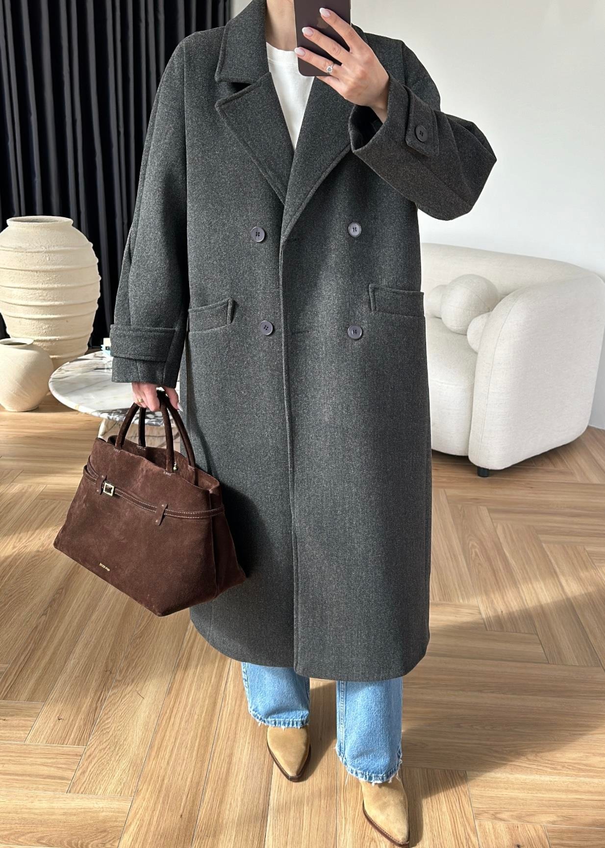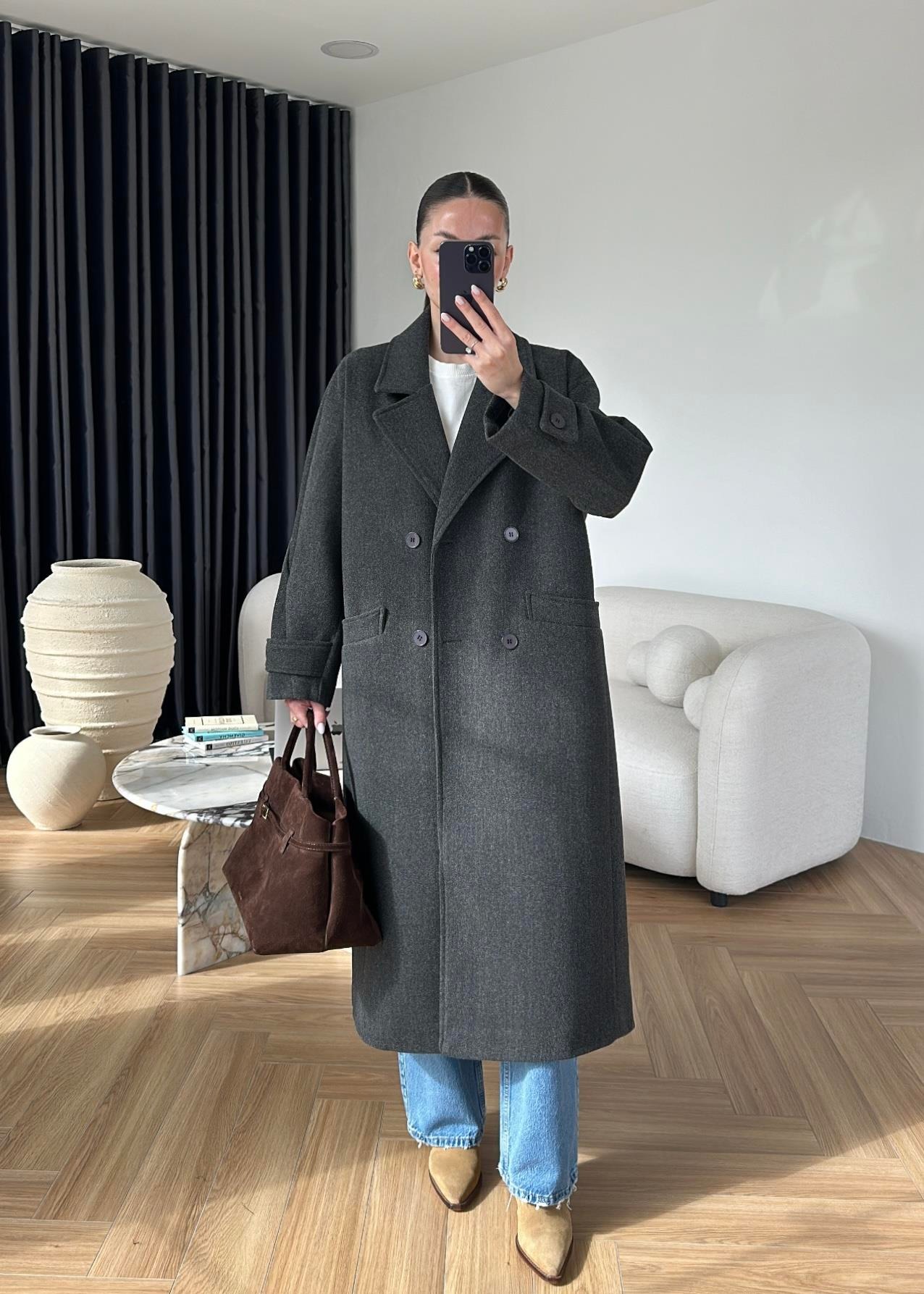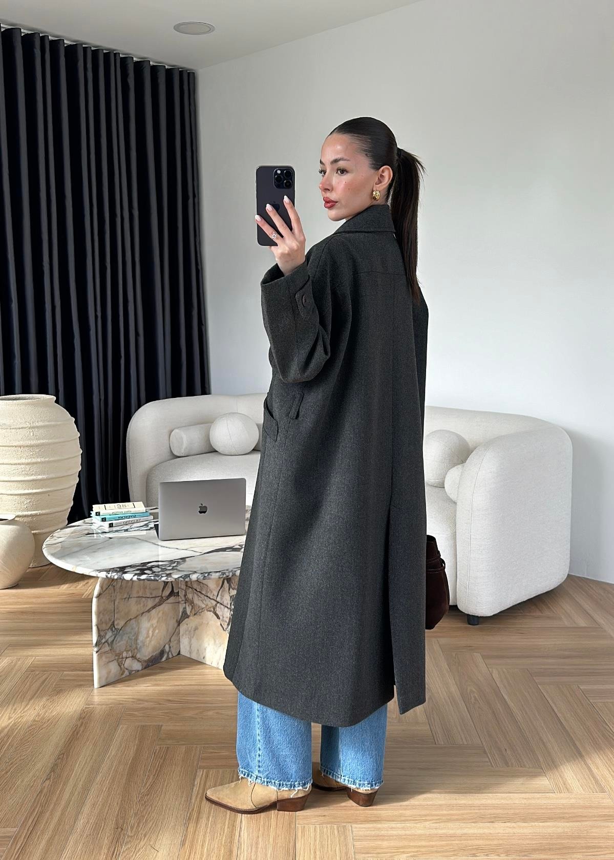 İki Düğmeli Kuşaklı Kaban KOYU ANTRASİT